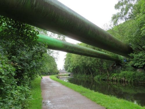 I can hear the quarry again now, but it’s on the other side of the river which is way below me, maybe 30 metres down from the canal. Two huge green pipes cross the canal and I become, for a moment or two, a tiny spider crawling under radiator pipes. More locks at Dawson Wood, and to my left I see that a shining UFO has landed on the brow of the hill. Looking again, it’s that miserable car park at Apperley Bridge station. Deflated a little, and wishing I had time to stop for a cuppa at Toby’s Tea Room (don’t worry Toby, I’m coming back soon), I drop down to the tiny swing bridge at Apperley Bridge and then trudge the final arc back to the car.