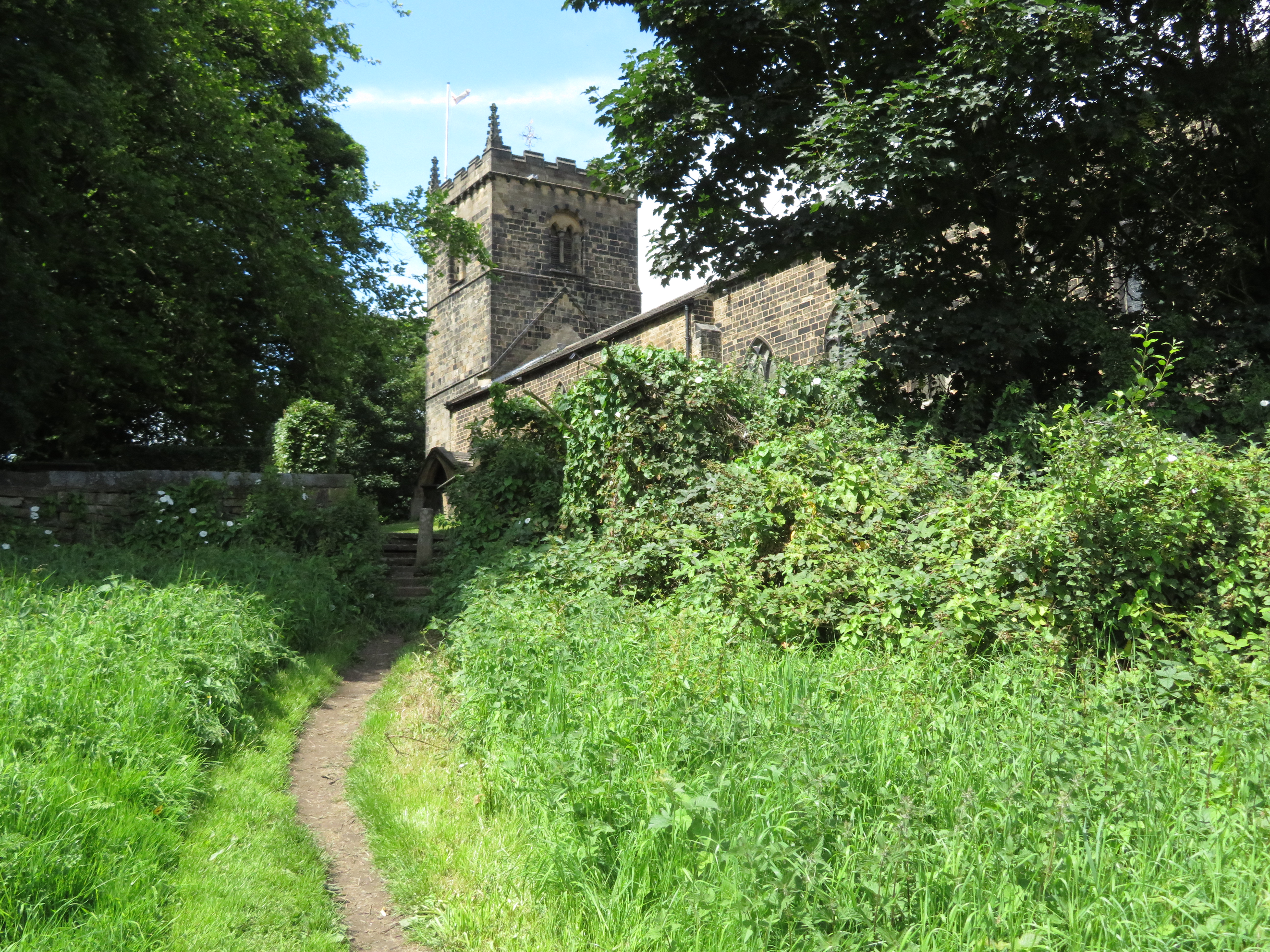 A trudge against the oncoming traffic on Hey Beck Lane takes us under an ornate but tired ‘Welcome to Kirklees’ sign, and then we veer off along the edge of Woodkirk Beck. Some sheep seem to be telling us there’s a bar nearby, but instead we cross a ‘Foot Golf’ course and then pause for breath (or, more precisely, crisps) in the churchyard of St Mary’s Church, Woodkirk. The parish dates back to the Doomsday Book and the tower is 12th Century.