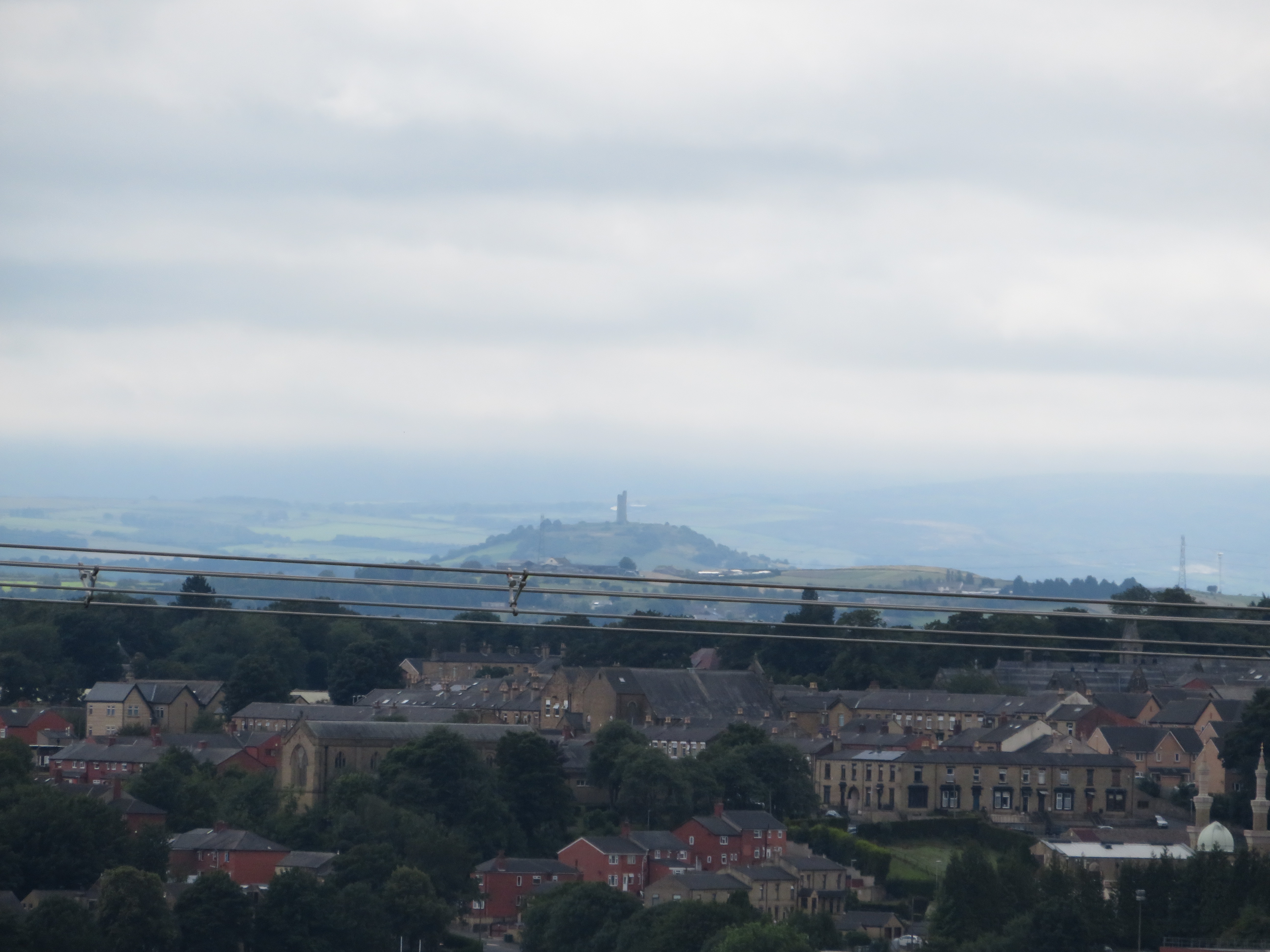 Nevertheless, it’s amazing that such a vast quarry is almost completely hidden, and eventually we stumble into the lumpy remains of Howley Hall. Here we intersect with the Dewsbury to Pudsey walk I made last winter, but in summer this is a popular spot, and we share our lunch venue with at least four other groups. Two parents laboriously lug a pushchair over the ruins. High voltage power lines slice through the panorama of Batley and Dewsbury, and towards Castle Hill. The Elizabethan aristocrat who built this place would never have tolerated the view being carved up like that.